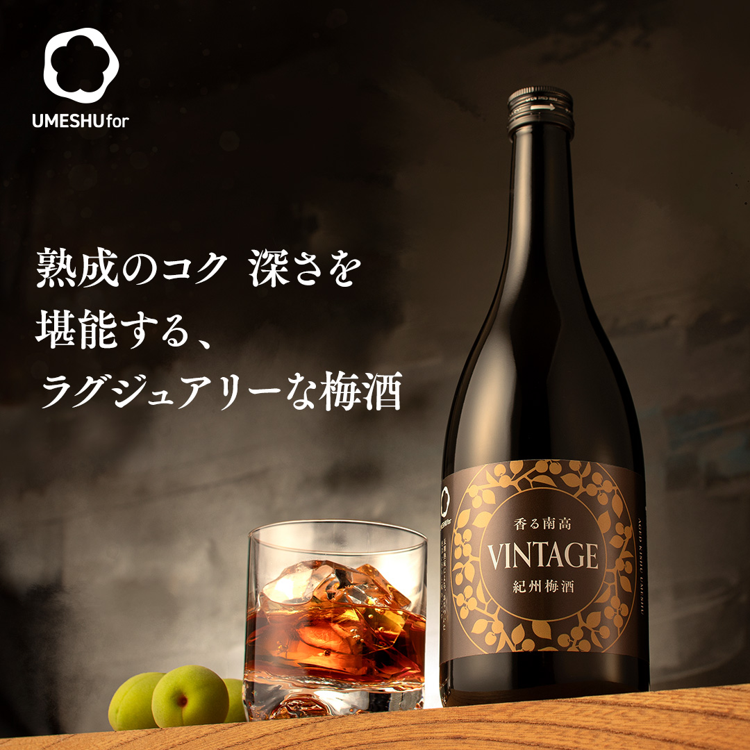 梅の産地・和歌山県で、特別農法で育てられた南高梅をじっくりと漬け込み、2008年より長期間にわたり熟成させた梅酒です。口に含んだ瞬間のファーストタッチから、喉ごしまで、全てに熟成から生まれた味わいをお楽しみいただけ、ワイングラスでストレート、またウィスキーのようにロックで大人ならではの時間を楽しめます。またGI和歌山梅酒に認定され、正真正銘の和歌山生まれ、和歌山育ちの梅酒となります。梅の産地 和歌山で酒蔵を続けてきた中野BCでは、梅を変えたり、ブレンドを変えたりしながら様々な梅酒の魅力を引き出してきました。特に熟成させた梅酒の深みを増した味わいには、きっと世界が広がる感覚を楽しんでいただけるのではないかと生まれたのが「香る南高 VINTAGE」です。梅酒は熟成されることで甘さや酸味がまろやかになり、少し渋みのような香ばしさが出てきます。特に香る南高VINTAGEに使用されている梅は大地の恵みをガッツリと吸収したかのようなワイルドさがあり、出来た当初(2009年頃)から野性味のあるテイストに仕上がっていました。時を重ねることで黄金色だった色合いはチョコレートのような琥珀色に変化。少しスモーキーさと渋みがあらわれ、ウィスキーのような味わいに梅の旨味が加わっているのを楽しめます。「梅酒は甘いから・・・」と敬遠してきた方に、ぜひ味わっていただきたい。大人な梅酒へと仕上がりました。ワイングラスやロックグラスなどBARのような雰囲気で、本格チョコレートなどに合わせて頂けます。また、カシューナッツやスモークチーズなど、少し塩味がありつつもマイルドな味わいのおつまみに合わせて頂くと抜群です。
